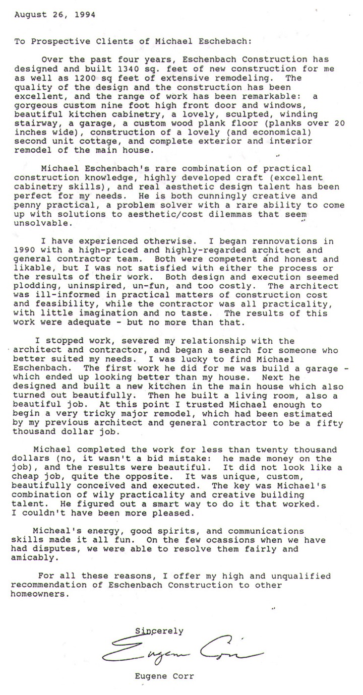 Michael Eschenbach, 966 Spruce Ave., Sebastopol, CA., 95472, 707-303-0496